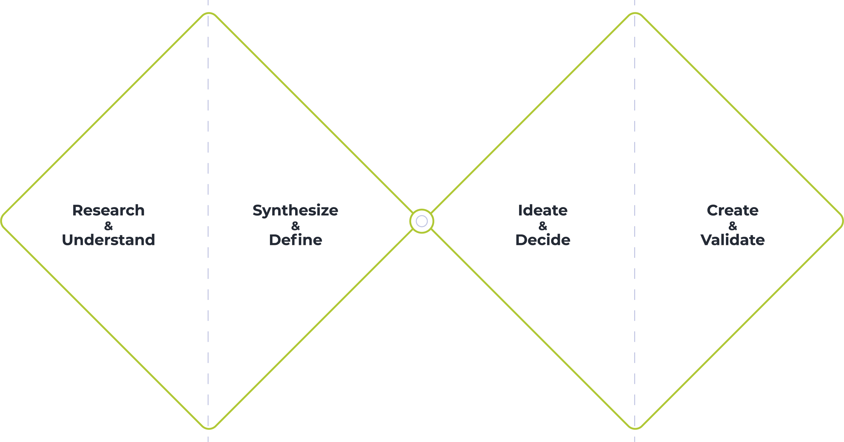 Our “Double-Diamond” approach to design thinking is our key to truly understanding user needs and iterating on solutions. The iterative process is broken down into 4 phases: research + understand, synthesize + define, iterate + decide, create + validate.
