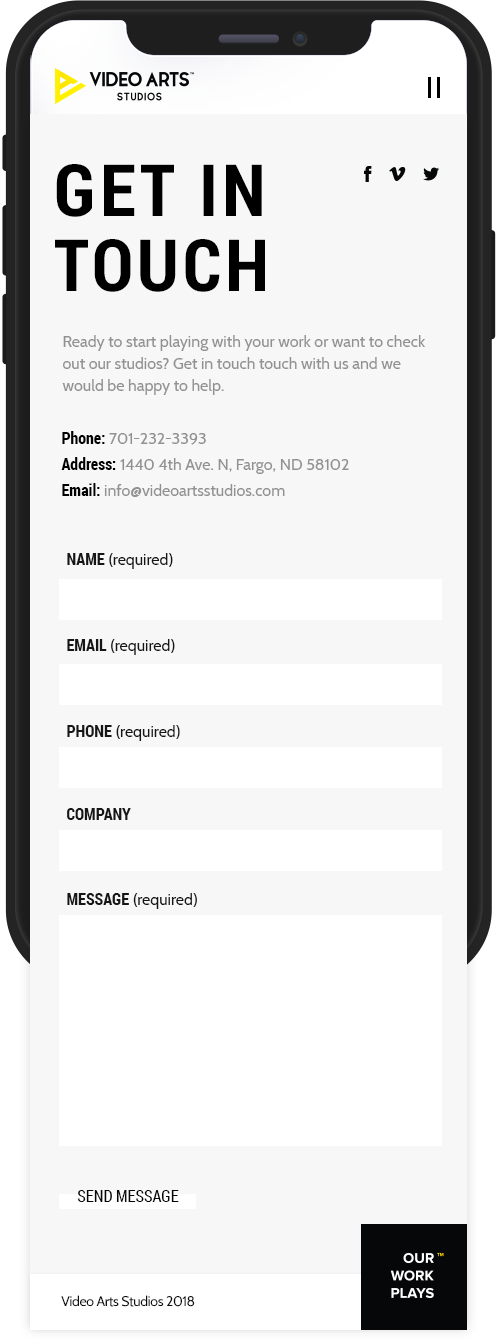 Typography talks just as loud as the actual words written. For the purpose of versatility and consistency Video Arts Studios selected Roboto Bold for headers and Cabin Regular for the body copy. These fonts are easy to read with desired letter spacing and carry through the mission of Video Arts on web and print materials.